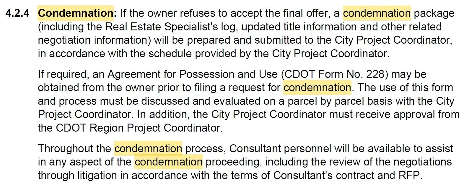 Condemnation enables the government to seize private property unwillingly. City of Fruita has contracted for Condemnation services - see this paragraph from City of Fruita’s Right of Way Acquisition Services Request for Proposal (RFP):